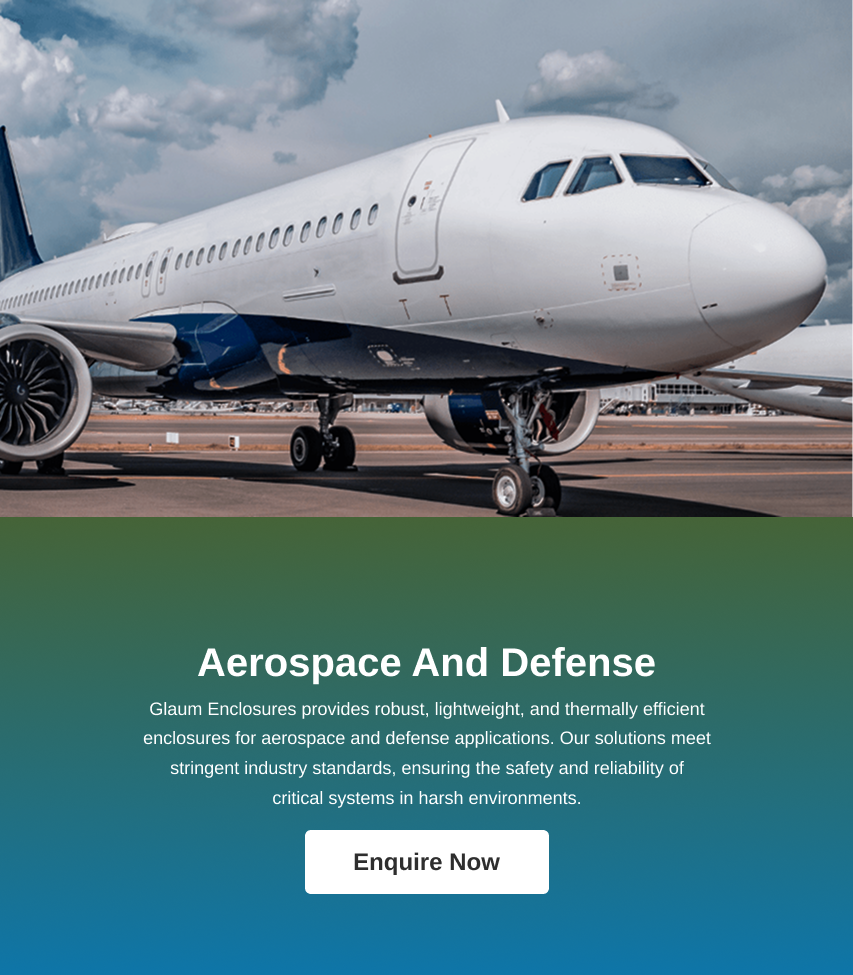 Glaum Enclosures provides robust, lightweight, and thermally efficient enclosures for aerospace and defense applications. Our solutions meet stringent industry standards, ensuring the safety and reliability of critical systems in harsh environments.